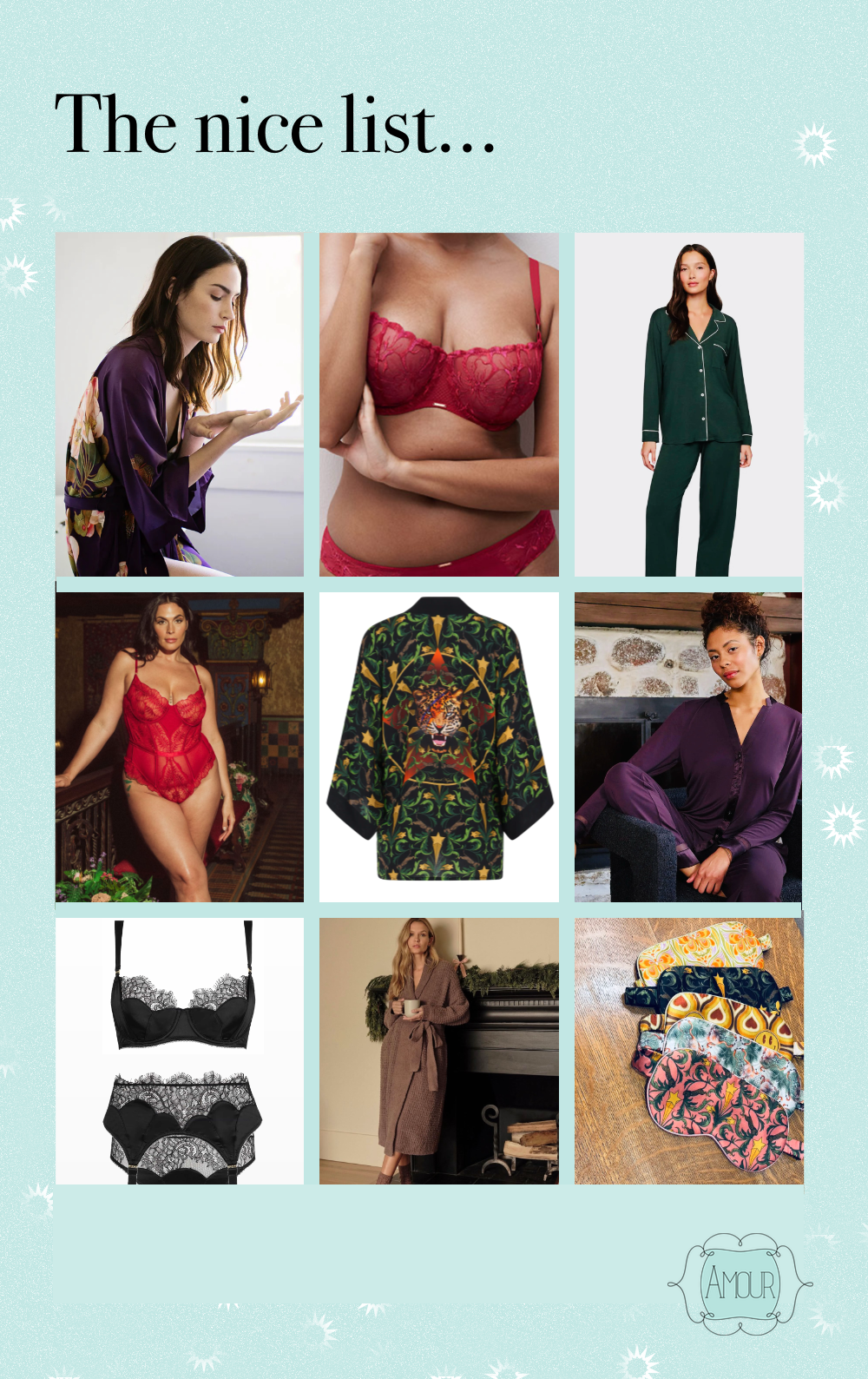 Bottom row: Esther bra/suspender/thong, noir, $80/$80/$45; Waffle robe available in pine and chestnut, $198; Silk Sleepmasks $49
